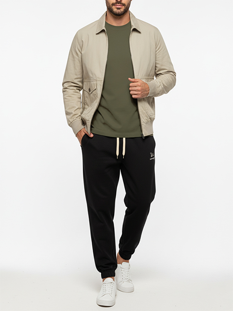 26 COORDINATE No.19 ベージュ×オリーブの男らしいアースカラーを、黒のジョガーパンツで都会的に引き締め。 足元の白スニーカーで軽快なヌケ感を演出すれば、リラックス感漂う大人の休日スタイルが完成。 気取らないのに品がある、大人カジュアルスタイル。